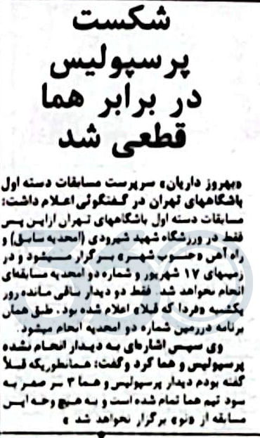 در ابتدا قرار بود بازی پرسپولیس و هما در تاریخ ۵ تیرماه برگزار شود اما رئیس ژاندارمری به علت جو سنگین جامعه در ماه‌های اولیه پس از انقلاب، مسئولیت برگزاری بازی را برعهده نگرفت و این بازی لغو شد. این اتفاق در حالی رخ داد که هیچ اطلاع‌رسانی در این زمینه صورت نگرفت و برخی هواداران هم بدون اطلاع از لغو بازی، به ورزشگاه آزادی رفتند.