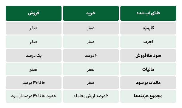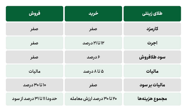 با این حال، طلای زینتی به دلیل هزینههای جانبی خرید و فروش، گزینهای گرانتر از سایر مدلهای سرمایهگذاری و خرید طلا محسوب میشود. این هزینهها شامل اجرت ساخت، مالیات بر ارزش افزوده و سود فروشنده است که در جدول زیر بهصورت خلاصه آمده است: