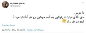 پس از انتشار یک ویدئو از همسرش مهدی کوشکی در اینستاگرام درباره ندادن حق طلاق به زنان، پارسا توییتی را منتشر کرد که همراهی خود را با همسرش در این ایده نشان می داد. اما نکته عجیب این بود که ظاهراً متن این توییت را مهدی کوشکی برای پارسا نوشته بود و او نیز بدون بازنویسی، آن را بر روی فضای مجازی قرار داده بود که در آن نوشته شده بود: « یا بنویس حق طلاق میدید به زنهاتون بعد اسم خودتون رو هم گذاشتید مرد؟ ایموجی هم نزار».