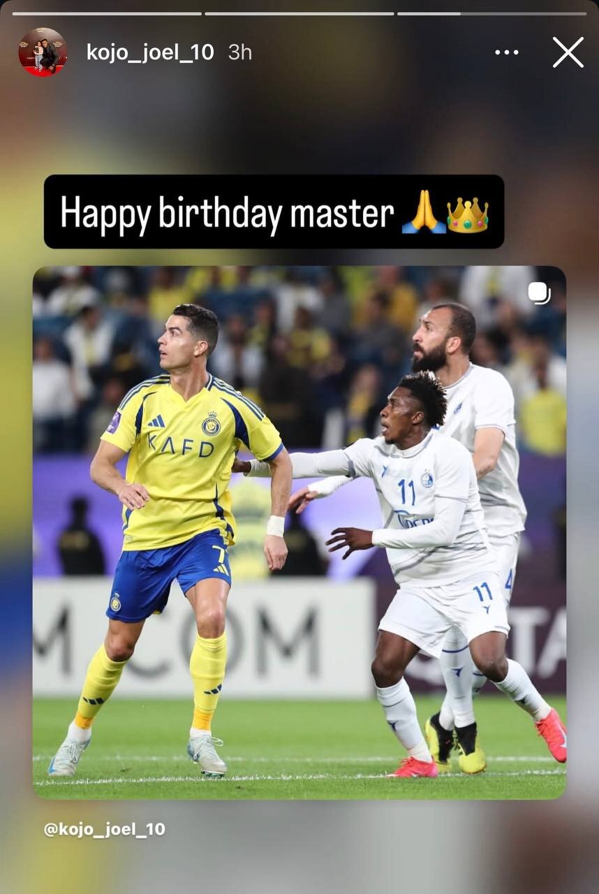 به گزارش خبرگزاری رونویس؛ جوئل کوجو، مهاجم قرقیزستانی استقلال که این روزها بهدلیل مصدومیت نمیتواند برای این تیم بازی کند، با انتشار یک استوری تولد کریستیانو رونالدو را تبریک گفت.